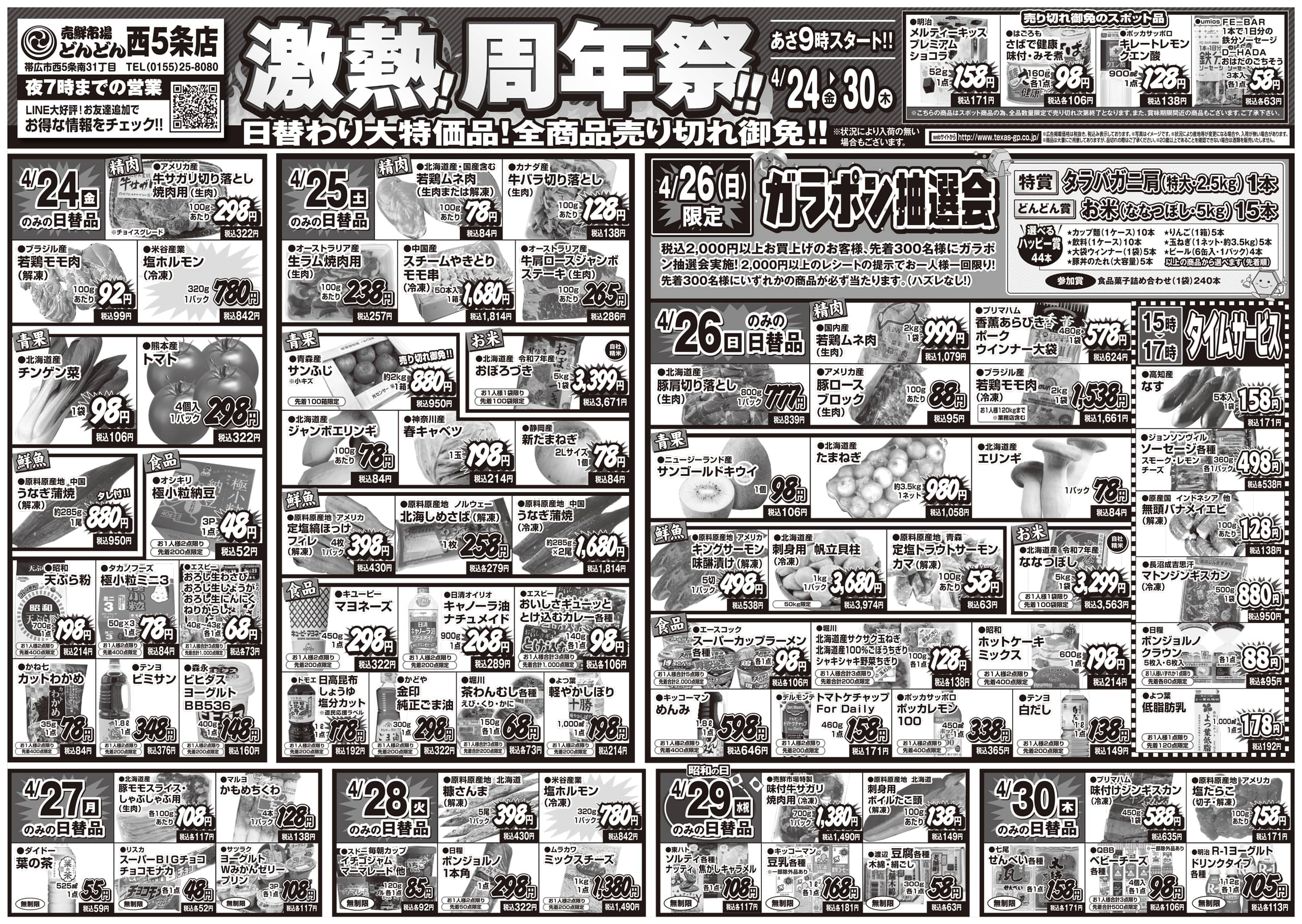 どんどん西5条店の単独企画といたしまして、「毎月5のつく日」ならびに「毎週火曜・日曜」に『激熱イベント』を開催いたします。お客様に楽しんでいただける内容をご用意しておりますので、ぜひご来店ください。