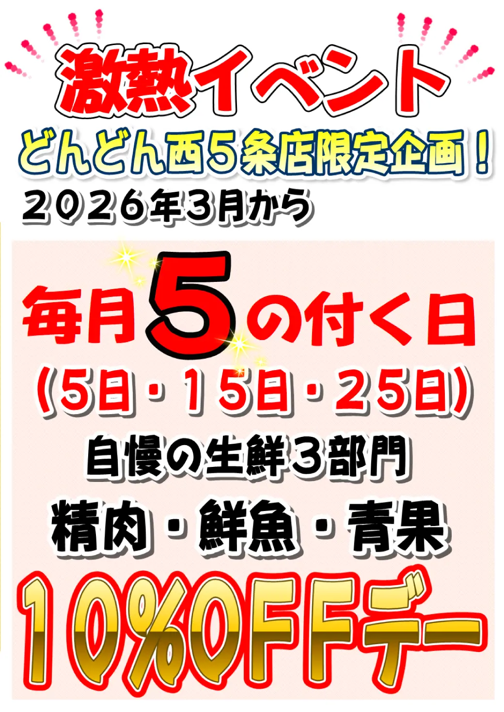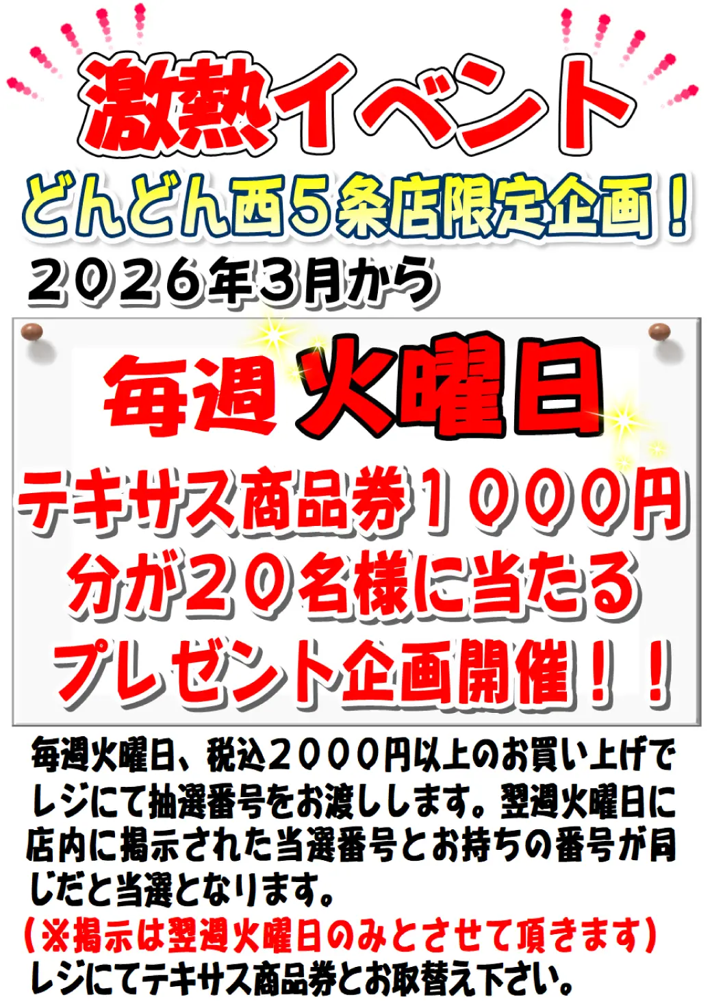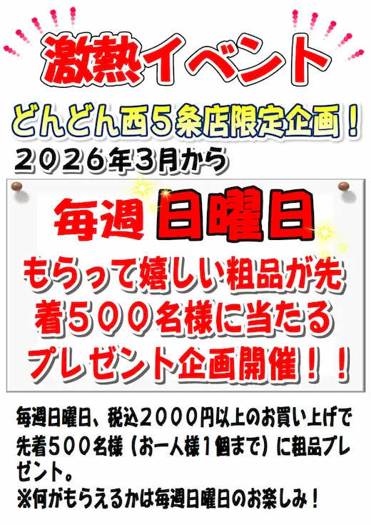 どんどん西5条店の限定企画といたしまして、「毎月5のつく日」ならびに「毎週火曜・日曜」に『激熱イベント』を開催いたします。お客様に楽しんでいただける内容をご用意しておりますので、ぜひご来店ください。