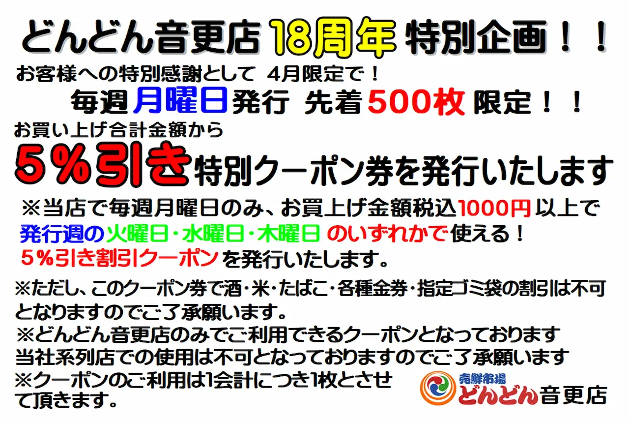 どんどん西5条店の単独企画といたしまして、「毎月5のつく日」ならびに「毎週火曜・日曜」に『激熱イベント』を開催いたします。お客様に楽しんでいただける内容をご用意しておりますので、ぜひご来店ください。
